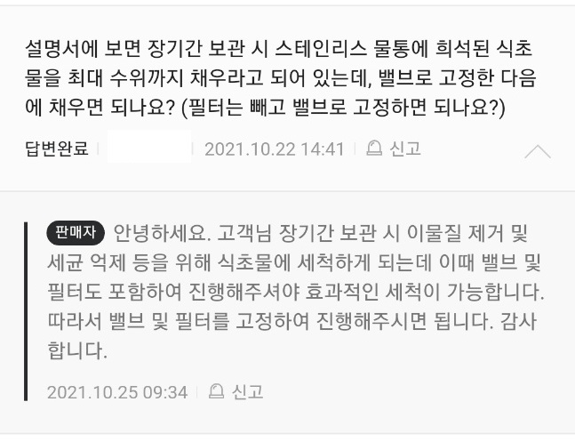 무튼 가습기를 해체해서 청소하는 부분 설명할건데 궁금한 부레나 본체 부분은 네이버 판매 페이지에 Q&A로 판매자가 답변 단 부분 참고해서 청소했다.